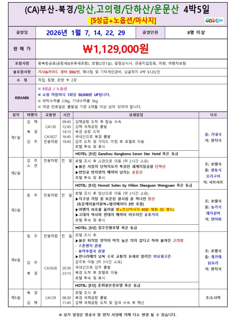 요즘 핫한 관광지!! 망산!! 북경/간저우 항공 이동 망산 4박 5일 망산 상품 중 Best of Best 일정!! ★★...