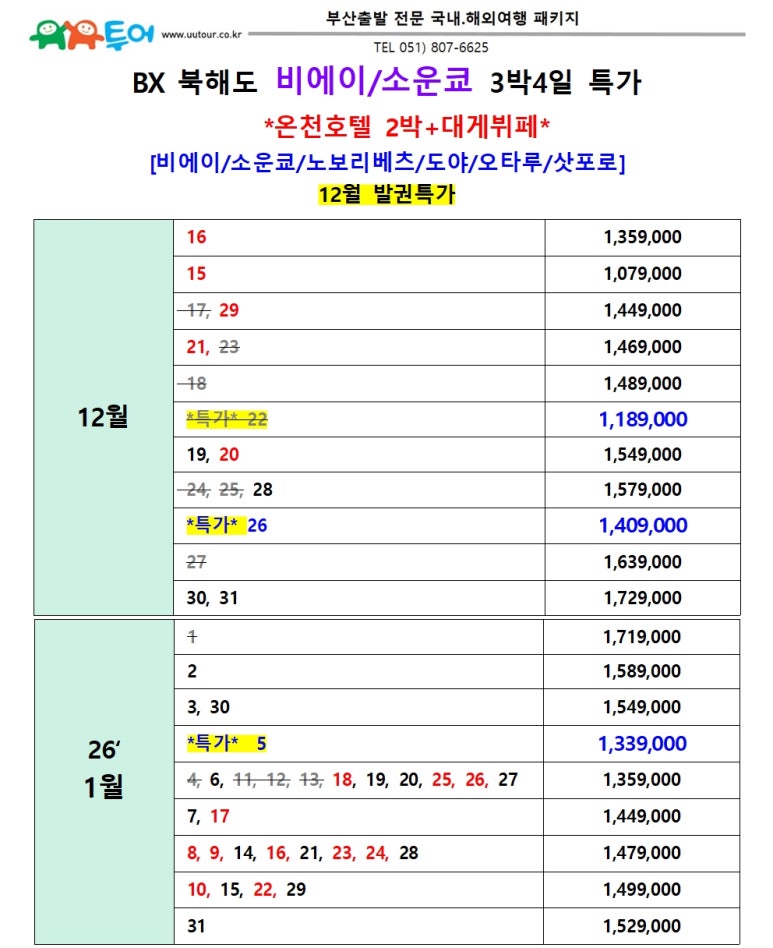 부산출발 북해도 3박4일 비에이/ 소운쿄 [온천2박+대게뷔페] BX - 유유투어 패키지 전문 여행사