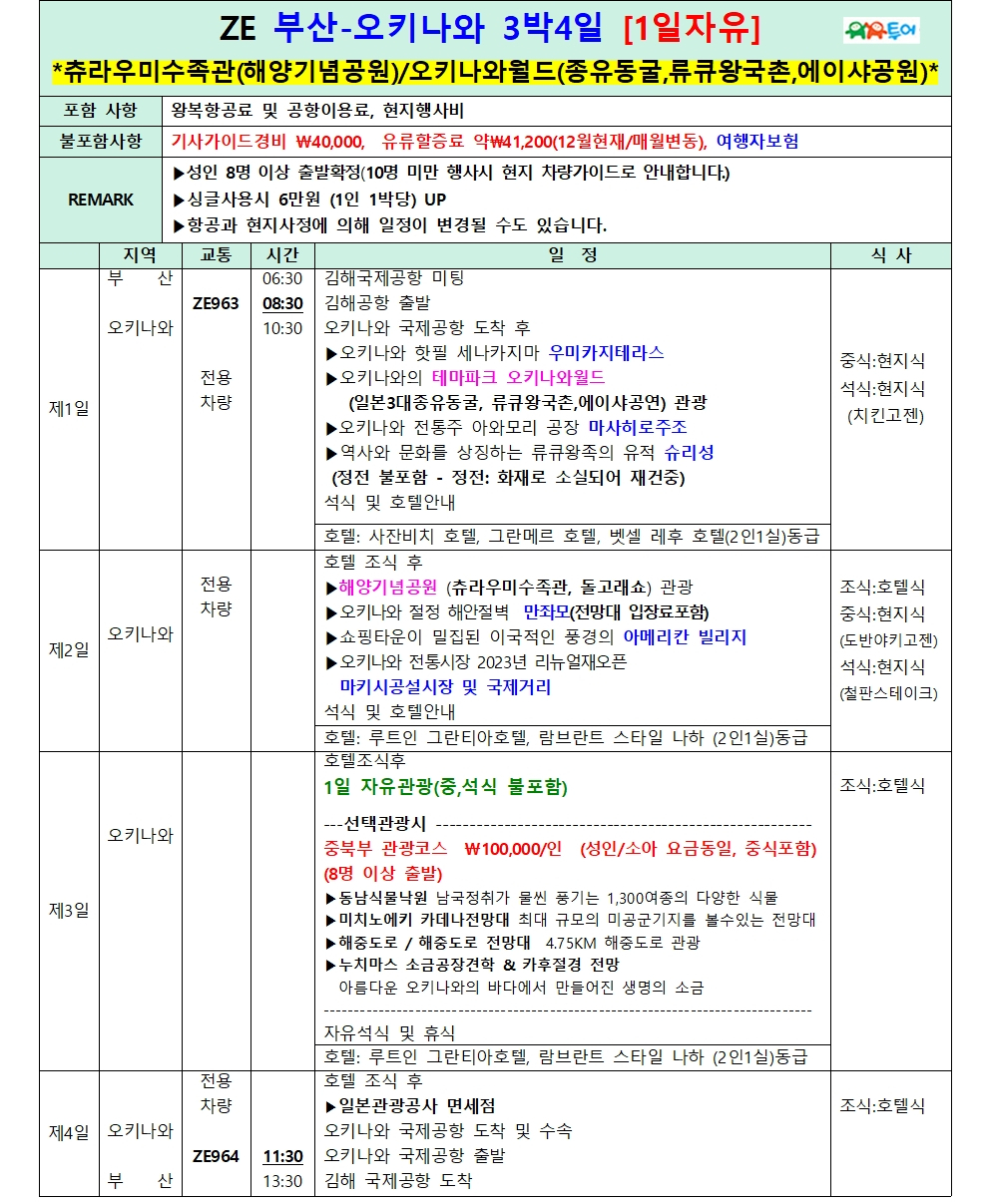 | 부산출발 오키나와 [노팁/노옵션+노쇼핑] 7월~10월 특가 ZE - 유유투어 패키지 전문 여행사 (0) | 2025.07.15 |