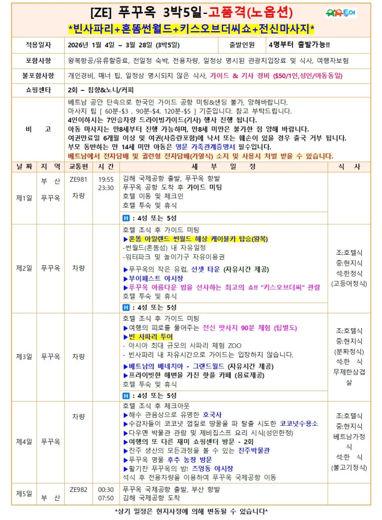 부산출발 푸꾸옥 [노옵션-빈사파리+혼똠썬월드+키스오브더씨+마사지] 1월~3월 스팟특가 ZE - 유유