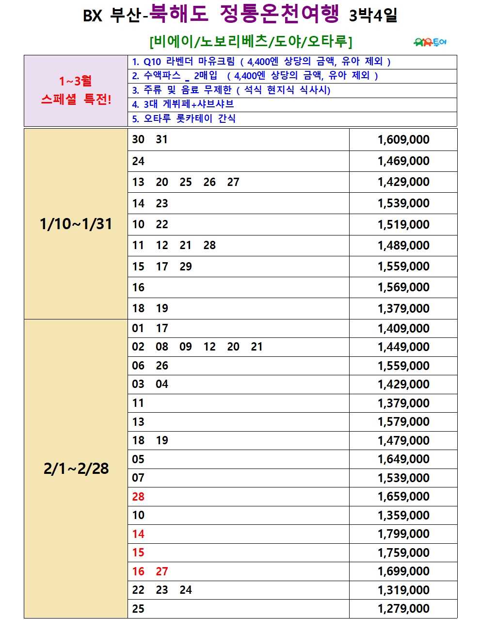 | 부산출발 북해도 정통 3박4일 [온천2박+대게뷔페&샤브] 1월~3월 특가 BX - 유유투어 패키지 전문 여행사 (0) | 2026.01.06 |