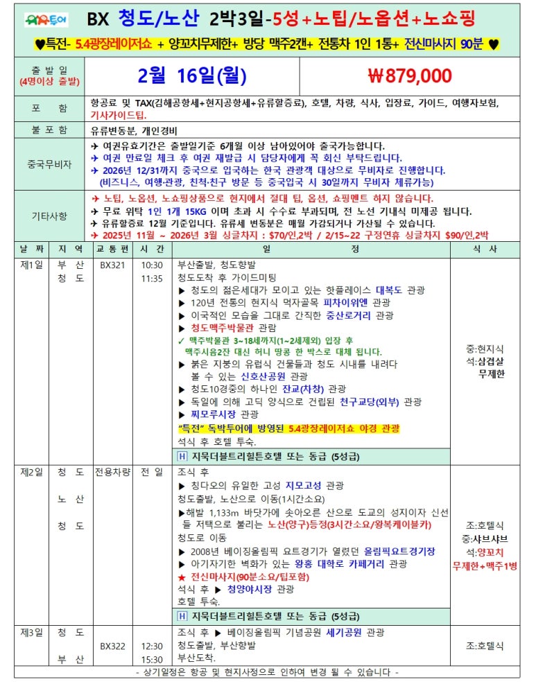 | 부산출발 청도(칭다오)/노산 2박3일 [정5성+노팁/노옵션] 1월~3월 특가 BX - 유유투어 패키지 전문 여행사 (0) | 2025.12.30 |
