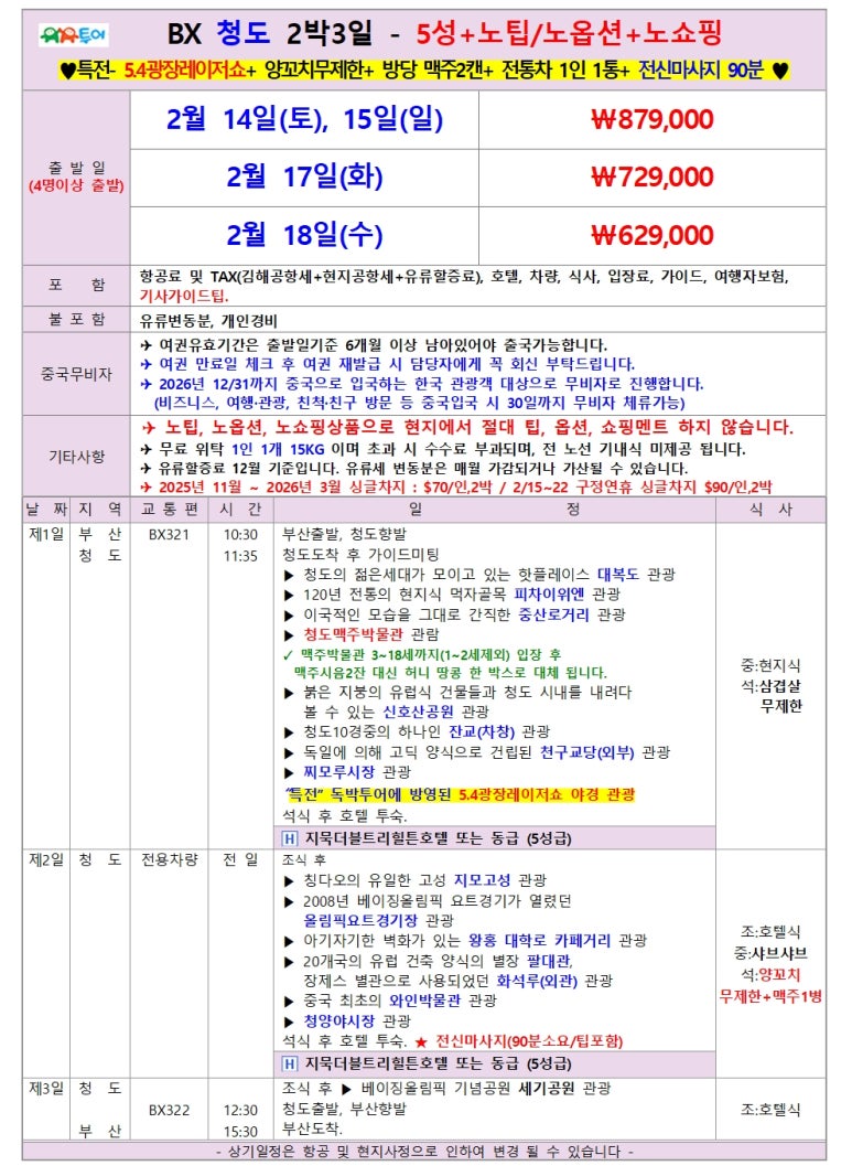 | 부산출발 청도(칭다오) 2박3일 [실속/품격] 1월~3월 특가 BX - 유유투어 패키지 전문 여행사 (0) | 2025.12.29 |