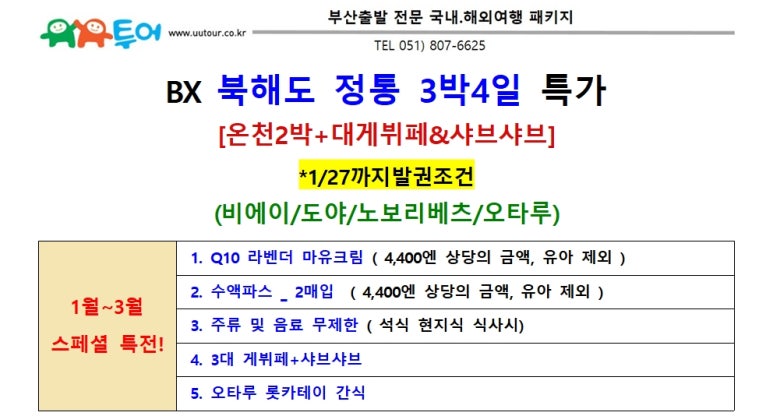부산출발 북해도 정통 3박4일 [온천2박+대게뷔페&샤브] 1월~3월 특가 BX - 유유투어 패키지 전문 여