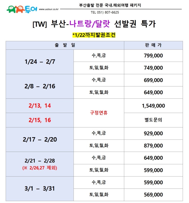 | 부산출발 나트랑, 달랏 - 구정 설연휴 선착순 특가 [5성+노팁/노옵션] VJ (오전) - 유유투어 패키지 전문 여행사 (0) | 2026.01.15 |