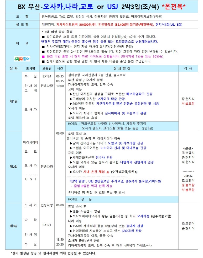 | 부산출발 오사카 2박3일(조/석) 4월~7월 특가 [온천욕포함] BX - 유유투어 패키지 전문 여행사 (0) | 2026.01.29 |