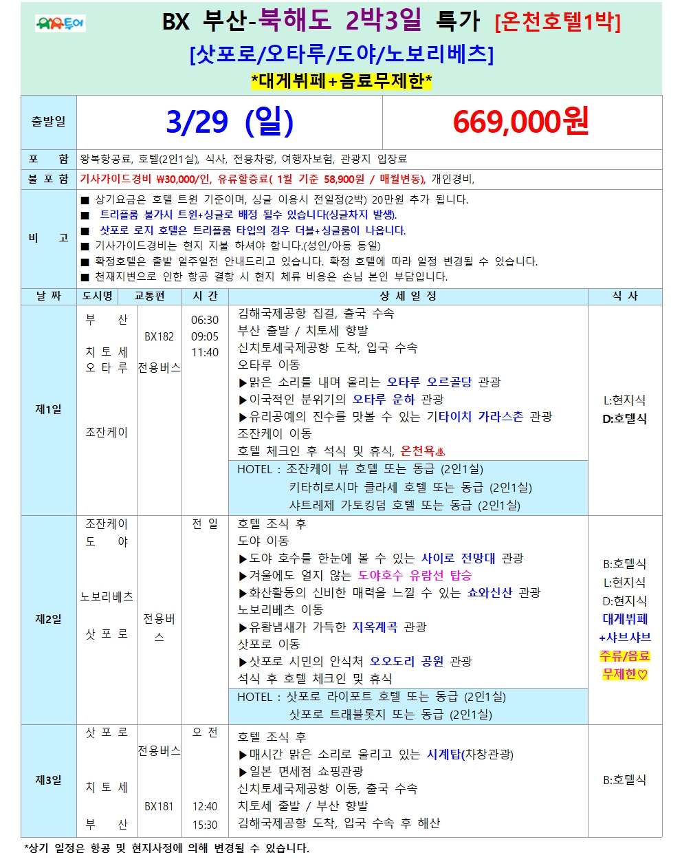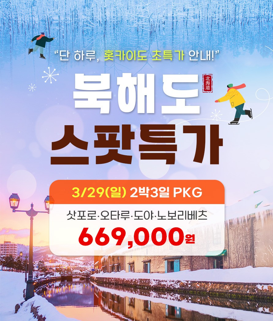 💥 북해도 스팟특가 2박3일 3/29(일) - 669,000원 ✔ 북해도 오타루/도야/노보리베츠 2박3일 ✔ 짧은 휴...