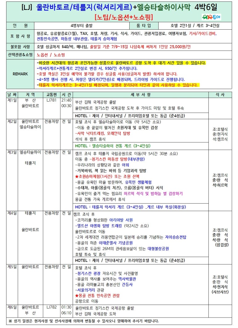 월요일-4박6일 [울란바토르/테를지+엘승타슬하이사막]