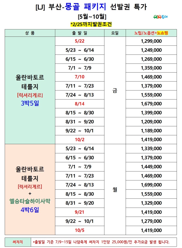| 부산출발 몽골 여행 [노옵션] 8월~9월 선발권 특가 BX - 유유투어 패키지 전문 여행사 (0) | 2025.08.20 |