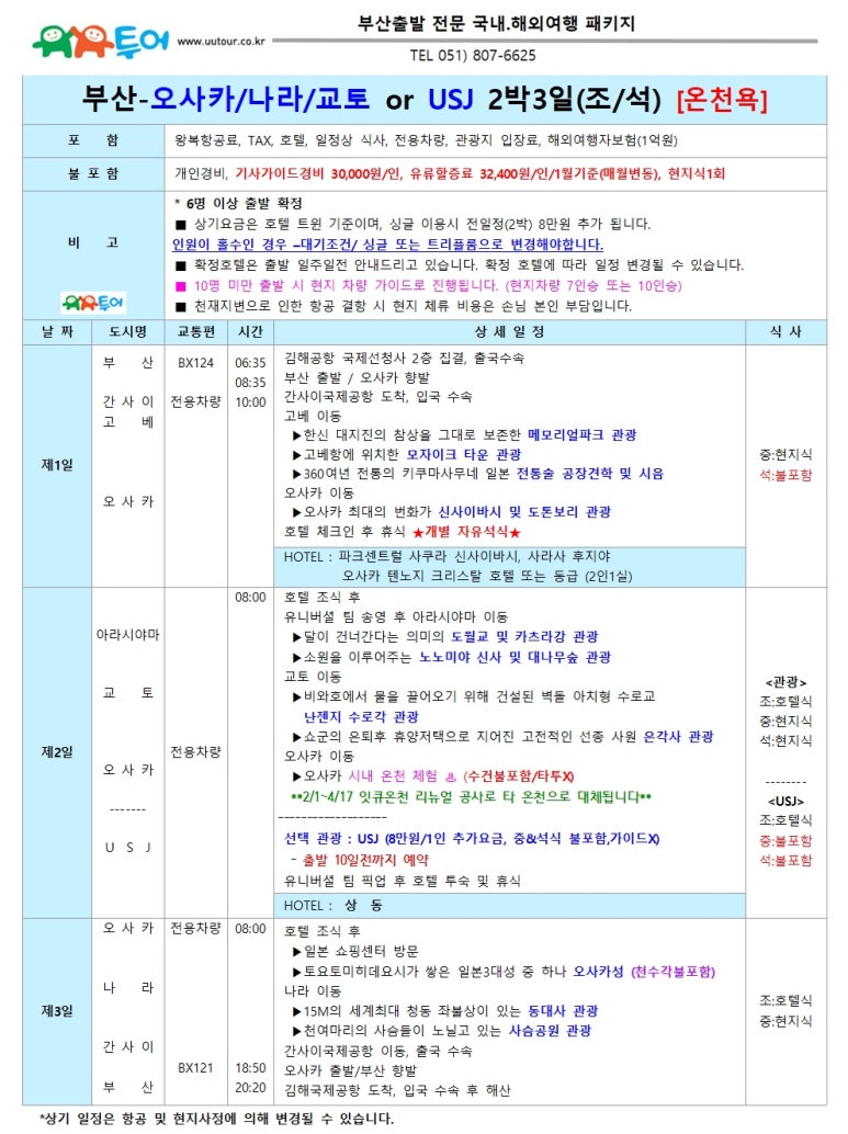 | 부산출발 오사카+와카야마 동굴 온천 2박3일 [온천호텔2박] 2월~3월 스팟특가 ZE, BX - 유유투어 패키지 전문 여행사 (0) | 2026.01.14 |