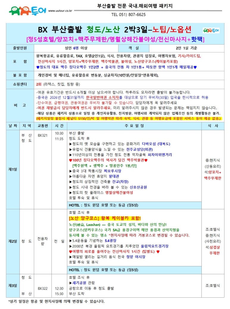 | 부산출발 청도(칭다오) 2박3일 [실속/품격] 1월~3월 특가 BX - 유유투어 패키지 전문 여행사 (0) | 2025.12.29 |