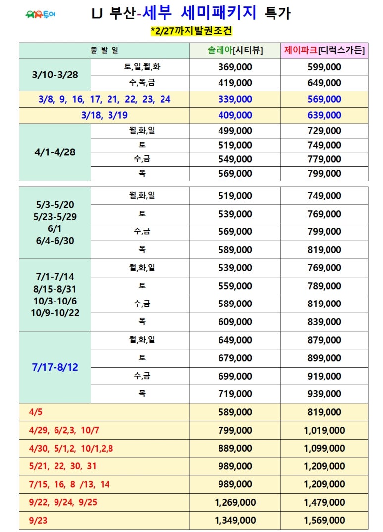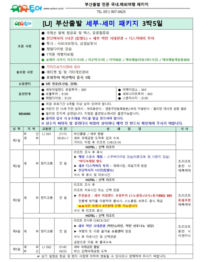 | 부산출발 세부 솔레아 세미 패키지 4월~10월 선발권 특가 BX - 유유투어 패키지 전문 여행사 (0) | 2026.03.19 |