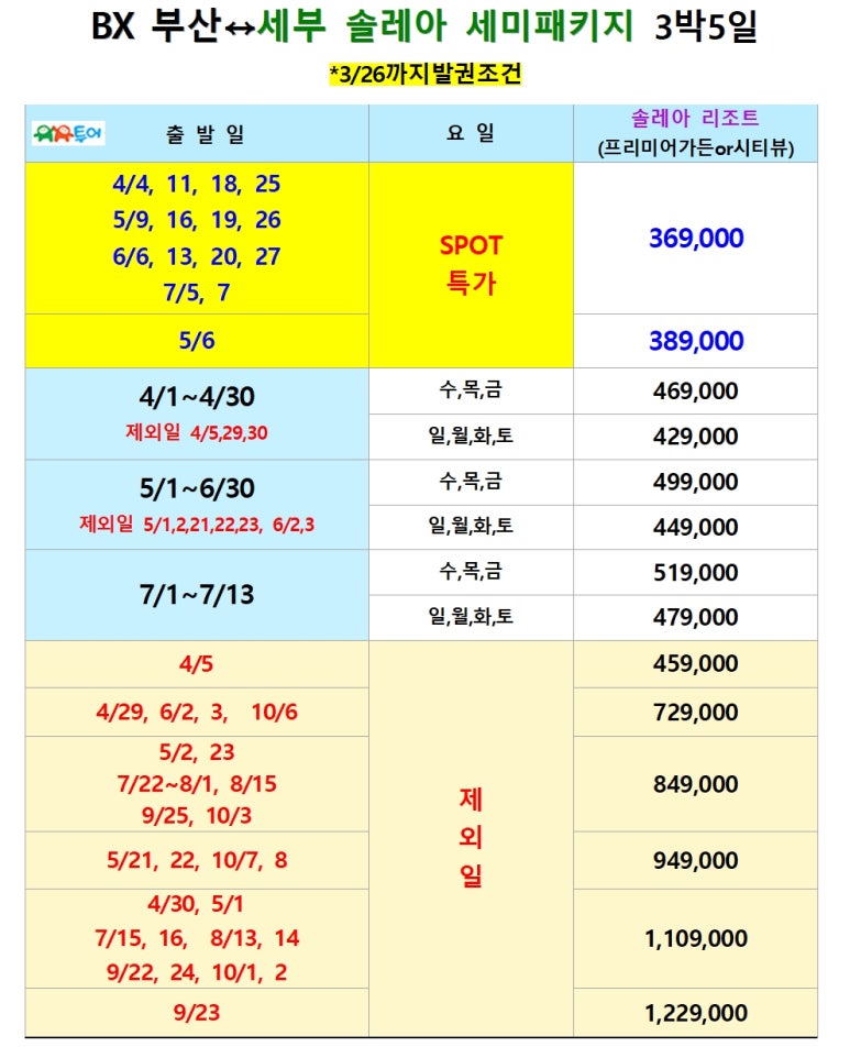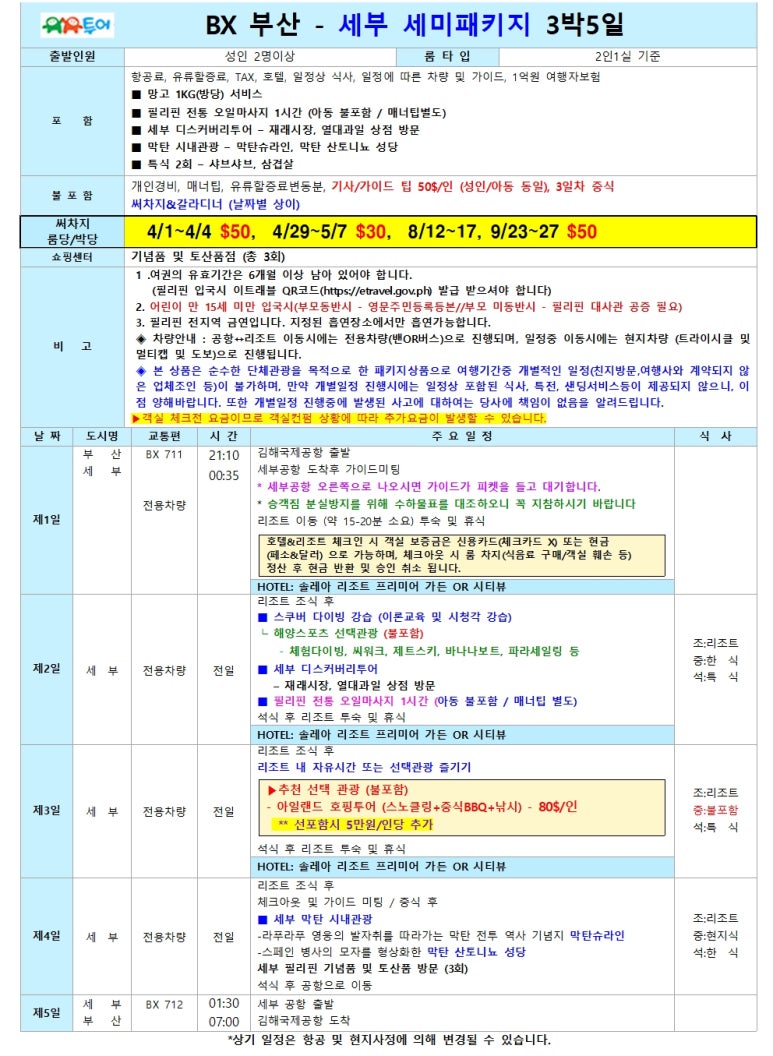 부산출발 세부 솔레아 세미 패키지 4월~10월 선발권 특가 BX - 유유투어 패키지 전문 여행사